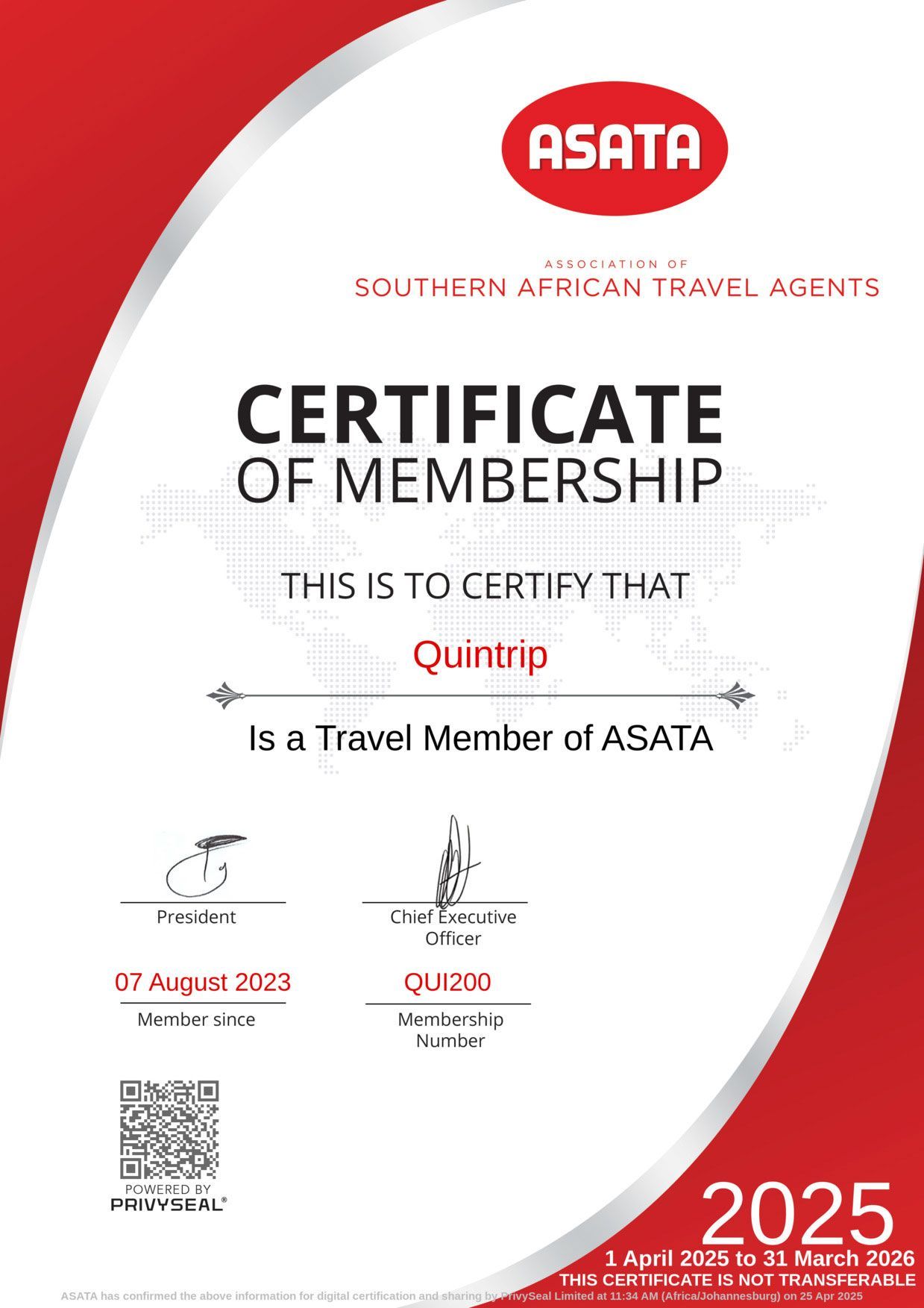 Representing a remarkable 90% of the travel industry, ASATA is not only a symbol of trust but also a powerful advocate for fair practices and exceptional service. At Quintrip, we're honored to be registered with ASATA, aligning our commitment to your travel satisfaction with the high standards set by this esteemed association.